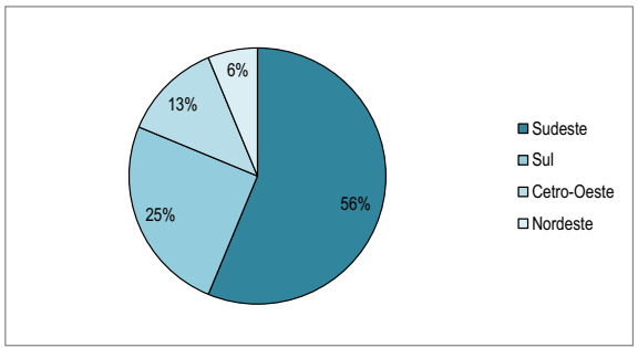 A Figura 3 mostra a origem geográfica das instituições que produziram artigos sobre BPM para as revistas pesquisadas. Embora havendo poucos artigos, as publicações advêm de diferentes regiões do País, estando somente a região Norte sem publicações. A região Sudeste é a que possui maior número de contribuições acadêmicas quanto ao assunto, com 56%das publicações. A região Sul está em segundo lugar, com 25% das publicações, seguida, em terceiro lugar, pela região Centro-Oeste, com 13% e pela região Nordeste, com 6%. É provável que a concentração da produção de artigos esteja refletindo a distribuição geográfica das instituições de ensino superior no Brasil.