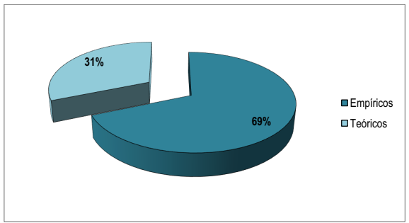 Outro aspecto relevante é a relação entre artigos empíricos e teóricos. Foram identificados 11 artigos empíricos - ou seja, são aqueles que possuem comprovação prática de algo - equivalente a 69%, e cinco artigos teóricos - que são aqueles que consistem na comprovação teórica -, o que corresponde a 31% dos trabalhos, conforme demonstrado na Figura 4. O fato de o maior percentual envolver estudos empíricos demonstra que os pesquisadores dão preferência a fenômenos reais que ocorrem nas organizações.