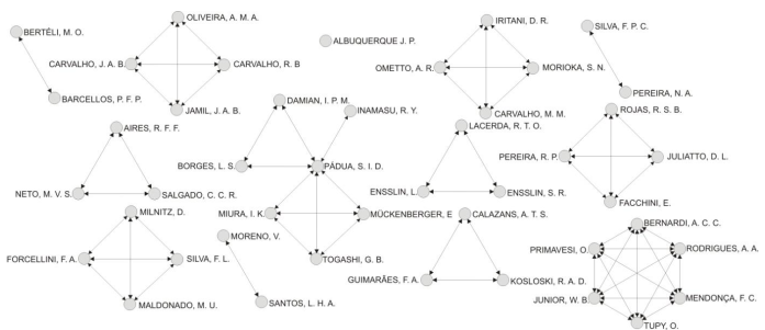 A Figura 5 ilustra de forma clara as conexões de coautoria estabelecidas pelos autores identificados. É fácil perceber que não há muitas conexões entre os autores, havendo somente um deles que participa de mais de um grupo de coautoria, ficando os demais grupos isolados. Cabe destacar que foram identificados seis artigos que possuíam colaboração entre autores que desempenham suas atividades em diferentes instituições.
