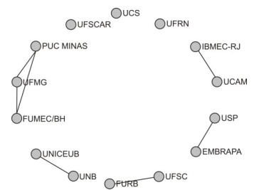 A Figura 6 demonstra a rede de colaboração científica entre as instituições quanto à elaboração de artigos sobre BPM. De acordo com a respectiva figura, é possível identificar uma rede de conexões de coautoria nas seguintes instituições: PUC Minas; UFGM; FUMEC/BH; Uniceub; UNB; Furb; UFSC; Embrapa; USB; Ucam e Ibmec-RJ. As instituições UFRN, UCS e Ufscar possuem apenas coautoria intragrupo. A maioria dos casos de coautorias existentes se dá apenas entre duas instituições, o que demonstra uma tímida cooperação institucional entre as entidades que promovem pesquisas sobre o assunto.