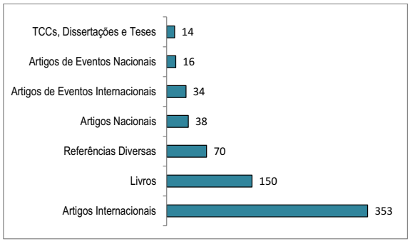 Existe predominância nas referências bibliográficas de artigos internacionais como principais fontes de conteúdo, sendo responsável por mais da metade dos casos, cerca de 52,3%. Os livros são a segunda fonte mais utilizadas, com 150 registros. Em terceiro lugar, são utilizadas referências diversas, como, por exemplo, manuais, websites, documentos eletrônicos, legislações, entre outros. Os tipos de referências menos usuais são Trabalhos de Conclusão de Cursos - TCCs, dissertações e teses. Assim, com base nesses dados, há evidências de uma tendência de as revistas brasileiras selecionarem artigos que contemplem nas suas citações os periódicos internacionais.