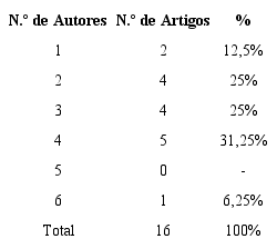 A Tabela 2 apresenta uma relação entre o número de autores participantes por artigo versus o número de artigos sobre BPM. É possível observar que os artigos científicos produzidos são em sua maioria elaborados em colaboração entre autores. Apenas dois artigos foram produzidos somente por um autor. A maior frequência de participação mútua é a formação de grupos de quatro autores, seguida por grupos de dois e três autores. Não foram identificados, nesta pesquisa, artigos com cinco autores participantes, apesar de ter sido encontrado um artigo com seis participantes. Embora haja maior contração de grupos entre dois e quatro autores, não é possível afirmar que, quanto mais autores colaboradores por artigo, maior seja a quantidade de artigos por essas alianças publicados nas revistas analisadas.