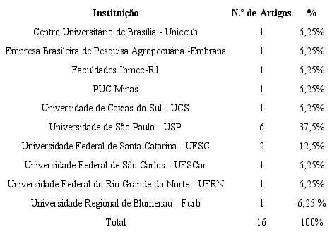 A Tabela 4 apresenta as instituições que publicaram artigos sobre BPM nas revistas analisadas. Como referência para a determinação da instituição de origem, foi considerado o primeiro autor de cada um dos artigos. Foram identificadas dez diferentes instituições, sendo nove universidades e uma empresa de pesquisas agropecuárias. Observamos que, além dessas instituições, foram identificadas outras quatro entidades a partir de redes de coautoria que são apresentadas na Figura 6. A Universidade de São Paulo - USP é a instituição com a maior quantidade de artigos publicados sobre BPM, com seis registros. A Universidade Federal de Santa Catarina - UFSC é segunda, com duas publicações. As demais instituições possuem apenas uma publicação sobre o tema.