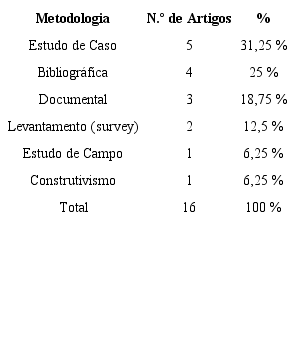 Os procedimentos metodológicos utilizados pelos artigos de BPM podem ser visualizados na Tabela 5. É possível identificar ao menos seis tipos diferentes de metodologias científicas, sendo a mais adotada o estudo de caso, com 31,25% dos casos, seguida de pesquisa bibliográfica, com 25% artigos. A terceira metodologia mais utilizada foi a documental, com 18,75%.