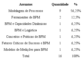 A Tabela 6 demonstra os principais assuntos abordados pelos artigos de BPM publicados nas revistas pesquisadas. Mais da metade dos artigos encontrados, 56,25%, trata de Modelagem de Processos, sendo este um dos assuntos mais difundidos pela literatura de BPM. Foram identificados dois artigos que abordam ferramentas de BPM e os demais assuntos abordados são dispersos e fazem um paralelo com a temática, nem sempre são, no entanto, assuntos típicos discutidos na literatura especializada.