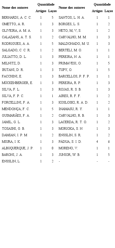 A Tabela 7 faz uma relação dos autores dos artigos, sua respectiva quantidade de artigos publicados e laços com outros autores. A partir dessa análise, é possível identificar 45 diferentes autores dos artigos publicados nas revistas investigadas. O único autor que possui mais de um artigo publicado é Pádua, S. I. D. Da mesma forma se observa que o referido autor é o que possui maior quantidade de laços com outros autores, com seis no total. Com base nesse fato é possível afirmar que a maior quantidade de laços favorece maior quantidade de artigos publicados, o que demonstra a importância de relacionamento e coautoria entre autores.