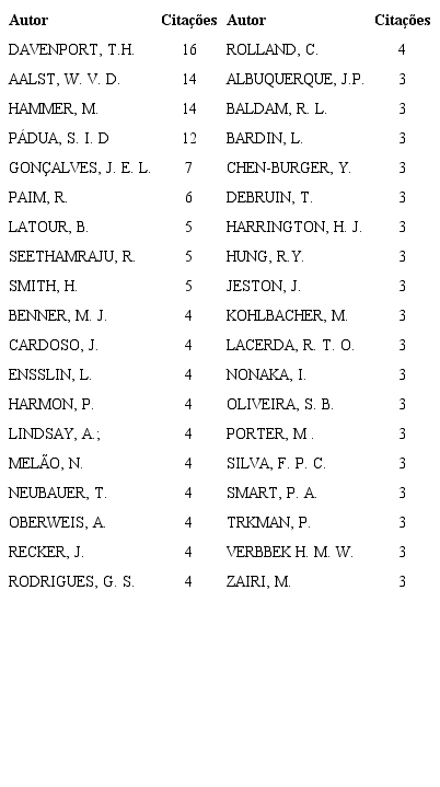 A Tabela 8 apresenta os autores mais citados nas referências bibliográficas dos artigos pesquisados. Foram contabilizados somente os autores que possuíam a partir de três citações, levando-se em consideração a soma de todos os artigos levantados. Dos principais autores citados nas referências bibliográficas, todos são pesquisadores especialistas em processos de negócio. Entre as citações estrangeiras, destaca-se o autor norte-americano Thomas H. Davenport, com 16 citações. Em seguida, empatados com 14 citações, o holandês Wil Vander Aalst e o norte-americano Michael Hammer. Os autores brasileiros mais citados nas referências são a professora universitária Silvia Inês Dallavalle de Pádua, com 12 citações, e o professor universitário José Ernesto Lima Gonçalves, com sete citações.