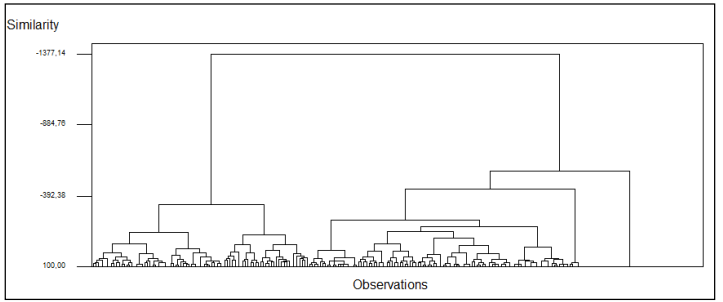 Inicialmente, utilizou-se o dendograma como forma de avaliar a quantidade de grupos que seriam estipulados no estudo, a fim de agrupar as principais características em cada um deles. Através do Ward’s Method, obteve-se o seguinte resultado (Figura 1).