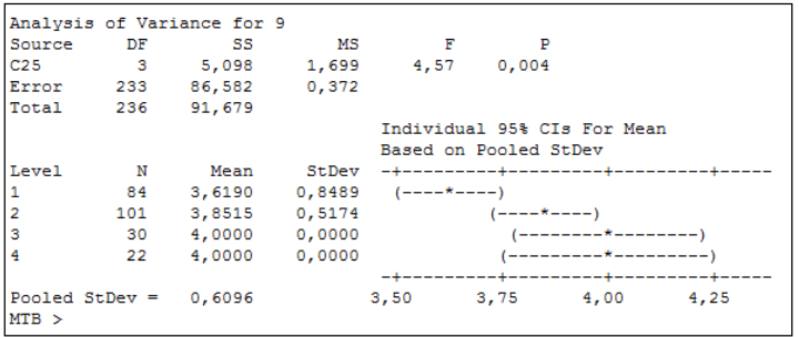 A Figura 2 apresenta os resultados gerados pelo software de análises quantitativas, indicando como cada um dos quatro grupos estipulados se diferencia ante um intervalo de confiança de 95%, estipulado anteriormente no cálculo de tamanho da amostra. Como pode ser visto no lado direito da Figura 2, as médias das respostas dos grupos 2, 3 e 4 praticamente não se diferenciaram quanto ao questionamento 9 apresentado (o questionário pode ser visto no Apêndice A). Contudo, o primeiro grupo apresentou respostas inferiores sobre o comportamento ético adotado.