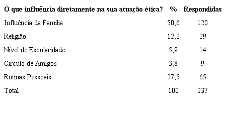 Embora os resultados das análises de dados não apontem para uma caracterização dos fatores que acarretam o comportamento ético, uma informação importante foi abstraída do estudo. Quando perguntados sobre o que influencia mais diretamente o comportamento ético das pessoas, a maioria dos entrevistados respondeu que a família é a principal responsável pela influência nas ações. Algo que pode ser explorado mais profundamente em estudos futuros (Tabela 2).