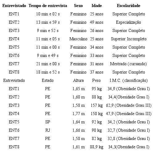 Em relação aos perfis corporais, todos os entrevistados são considerados obesos, a partir dos resultados obtidos com o Índice de Massa Corpórea (IMC), cujo cálculo é feito dividindo-se o peso do indivíduo por sua altura elevada ao quadrado. É importante ressaltar que o IMC não é o melhor parâmetro para se avaliar o peso ideal, pois não compreende atletas, pessoas muito musculosas, idosos e mulheres grávidas. Porém, a fim de não comprometer os resultados da pesquisa, nenhum dos entrevistados se encaixa no perfil dessas pessoas cujo IMC não apresenta exatidão no resultado. De acordo com os resultados do IMC obtidos, seis entrevistados possuem obesidade de grau I (IMC de 30 a 34,9 kg/m²) e dois são obesos de grau III (IMC > 40 kg/m²).