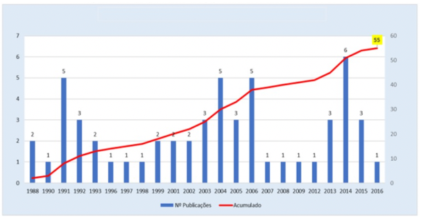 O processo de coleta nas bases resultou em 34 artigos obtidos dentro da Web of Science e 21 dentro da base Google Acadêmico, totalizando 55 artigos. Os autores precursores da temática negligência da omissão (omission neglect) foram Frank R. Kardes (1988) e David M. Sanbonmatsu (1988), constituindo-se estes como autores seminais para a compreensão da temática alvo deste estudo. Embora seja um tema delimitado, quando comparado a outros, a negligência da omissão vem despertando o interesse de diversos pesquisadores que a utilizam para estudos relacionados ao comportamento do consumidor. A Figura 2 demostra a evolução do tema entre os anos entre 1988 a 2016.