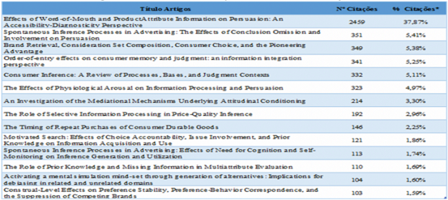 Constatou-se que, dentre os 55 artigos selecionados neste estudo, apenas 15 correspondem a 80% das citações identificadas nas plataformas pesquisadas, com destaque ao artigo intitulado Effects of Word-of-Mouth and Product-Attribute Information on Persuasion: An Accessibility-Diagnosticity Perspective, de autoria de Paul M. Herr, Frank R. Kardes e John Kim, publicado no ano de 1991, com 2.459 citações, ao longo de dezesseis anos, perfazendo uma média de 154 citações por ano. Em um universo de 68 autores identificados, apenas nove podem ser considerados altamente produtivos (96,88% das publicações), dentre eles, Herr, Kardes e Kim, responsáveis pela obra mais citada.