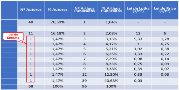 A Lei de Lotka, ou Lei dos Quadrados Inversos, pressupõe que um grande número de pequenos autores se iguala em produção ao reduzido número de grandes autores (Araújo, 2006). Em seus estudos, Lotka concluiu que autores com apenas duas publicações seriam responsáveis por ¼ de todas as publicações, ao passo que autores com três publicações são responsáveis por, resultando na expressão (Machado Júnior et al., 2016). De modo correlato, Price (1976) ajustou a expressão proposta por Lotka, configurando-a para. O ajuste realizado por Price demonstra que das publicações está associada a dos autores (Braga, 1974), e a elite altamente produtiva pode ser obtida pela expressão, na qual “k” representa o número total de autores relacionados ao tema em questão (Alvarado, 2009). Aplicando-se leis ao estudo do tema negligência da omissão, chegou-se aos resultados apresentados na Tabela 4.1.