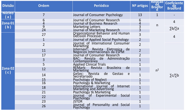 A Lei de Bradford, que compreende o grau de relevância dos periódicos em relação ao tema publicado, evidenciou que os 2/3 dos artigos que tratam da temática negligência da omissão estão concentrados em apenas cinco periódicos, destacados no núcleo (a) e zona 01(b), e são considerados os mais produtivos, com méritos para o Journal of Consumer Psychology (JCP), sendo este o periódico que mais publicou sobre o tema pesquisado, perfazendo um total de 13 publicações.