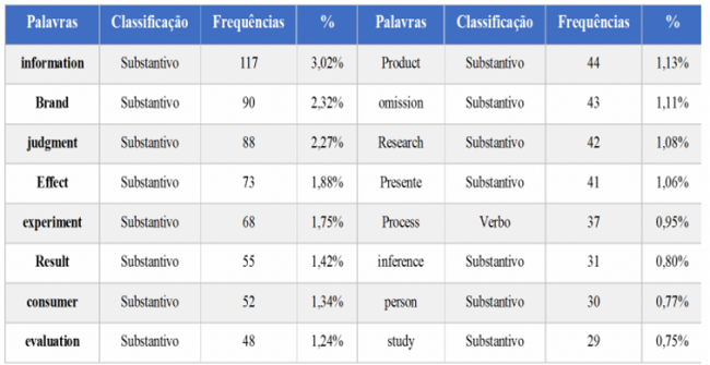 Considera-se que os termos “informação”, “marca”, “julgamento”, “efeito”, “experimento”, “resultado”, “consumidor” e “avaliação” são os mais ligados ao tema pesquisado (negligência da omissão), confirmados pelas obras, com maior frequência na contagem da frequência de palavras identificadas nos textos.