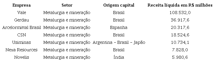 Foram estudadas as maiores empresas das indústrias metalúrgica e de mineração do Brasil. As empresas selecionadas, dispostas na Tabela 1, estão presentes na lista das 100 maiores empresas do Brasil, com base na receita líquida do setor, em 2017, como publicado no ranking Valor (2018). Foram selecionadas as empresas: Vale; Gerdau; Arcelormittal Brasil; CSN; Usiminas; Nexa Resources; e Novelis. Os dados foram coletados nos websites das empresas, entre os meses de abril e maio de 2019.