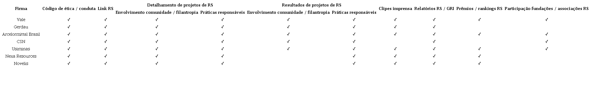 As empresas Vale, Gerdau, Arcelormittal, Usiminas, Nexa Resources e Novelis possuem link no website corporativo para o relatório de sustentabilidade. A CSN informa que utiliza critérios de mapeamento dos impactos ambientais, sociais e econômicos de acordo com as diretrizes do Global Reporting Initiative (GRI), para todas as suas operações. Não obstante, o relatório não está disponível no website corporativo, ainda que a empresa disponibilize um conjunto de informações sobre responsabilidade social e ambiental no website corporativo.