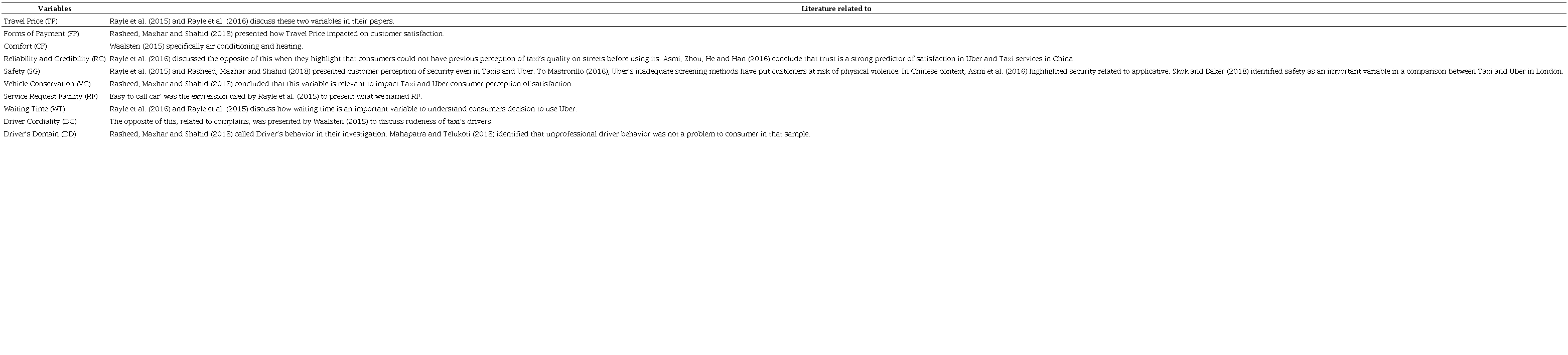 This investigation does not adopt a favorable or unfavorable position neither on the performance of Uber in Rio de Janeiro (Brazil) nor on the standard Taxi. Our goal here is to highlight some variables presented by other researchers who investigated Taxi or Uber’s satisfaction in the Marketing field. Thus, the main objective of this research was to identify and measure the most relevant variables that can impact Taxi and Uber’s Dissatisfaction and Taxi and Uber’s Satisfaction. The following section discusses some variables that may impact consumer satisfaction on Taxi or Uber’s services, in the context of Rio de Janeiro (RJ) city, not in Rio de Janeiro (RJ) state.