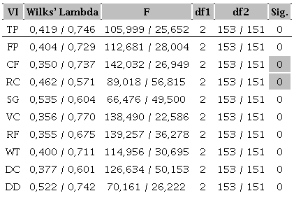 According to Bartlett, Simonite, Westcoot and Taylor (2000), Wilks’ Lambda is a test statistic used to test the existence of differences between the means of the groups of individuals identified in a combination of dependent variables. Their results vary on a scale of 0 to 1, with values close to zero, those with the best discrimination of the groups, in other words, they indicate a strong difference between the means. Table 1 also presents results from the F-ANOVA test, which helps to evaluate the previous test, demonstrating that the two variables that presented the lowest Wilks’ Lambda values obtained a satisfactory level of significance (sig.<0.05), which as standardized by Bartlett (1950), the value of 0.05 is considered statistically significant, it means, p<0.05 or sig.<0.05 (p-test or sig.).