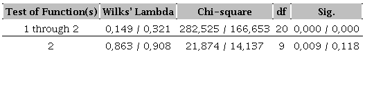 Table 3 presented the Wilks’ Lambda values, with the first line presenting the test of significance of the two functions on the same time, and the second line presenting the test of significance of function two separately.