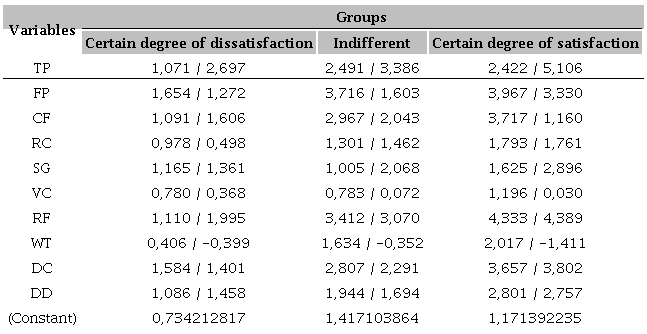 Table 2 presents the means tests of the groups to each explanatory variable, related to: Travel Price (TP), Forms of Payment (FP), Comfort (CF), Reliability and Credibility (RC), Safety (SG), Vehicle Conservation (VC), Service Request Facility (RF), Waiting Time (WT), Driver Cordiality (DC), and Driver’s Domain (DD). It also identified the variables that were the best discriminants of levels of satisfaction, in relation to the means of the groups (those with a certain degree of dissatisfaction, the indifferent and those with a certain degree of satisfaction).