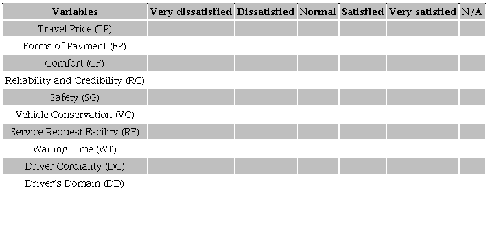 Regarding this present research, the dependent variable used is about a multicomponent qualitative nature and represents the satisfaction level of the users’, while the independent variables are related to attributes, tangible and intangible, of the service rendered, that directly affect the degree of customers’ satisfaction about the services provided by Taxi and Uber.