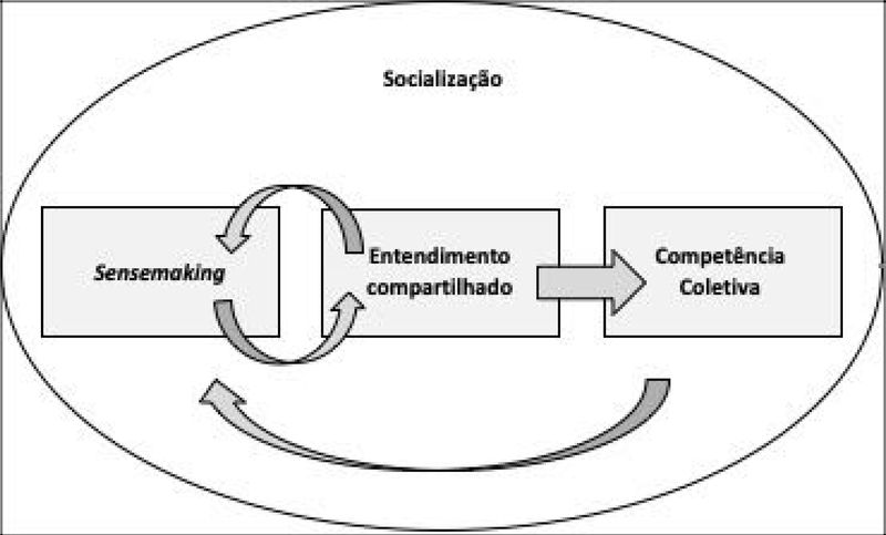 A figura 1, expressa a ideia que por meio da socialização é possível desenvolver um entendimento do trabalho, que após ser internalizado entre os membros da equipe é compartilhado e estruturado pela construção de significado das atividades. Sendo este entendimento compartilhado pelos membros, primeiramente desenvolvido e formado através do processo de sensemaking ( Klein & Bitencourt, 2012).