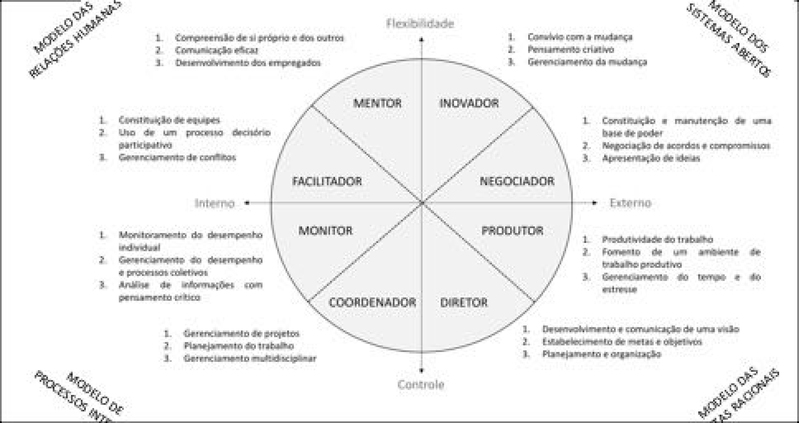 Alguns papéis desempenhados pelos líderes relacionados do lado esquerdo da figura são voltados para as atividades internas da empresa, enquanto do lado direito são voltados para o ambiente externo. Pode-se afirmar também que os papéis relacionados na parte superior da figura exigem dos líderes maior flexibilidade para lidar com pessoas e mudanças, enquanto na parte inferior possuem maior enfoque no controle, em virtude de suas principais funções estarem relacionadas ao estabelecimento de processos e metas.