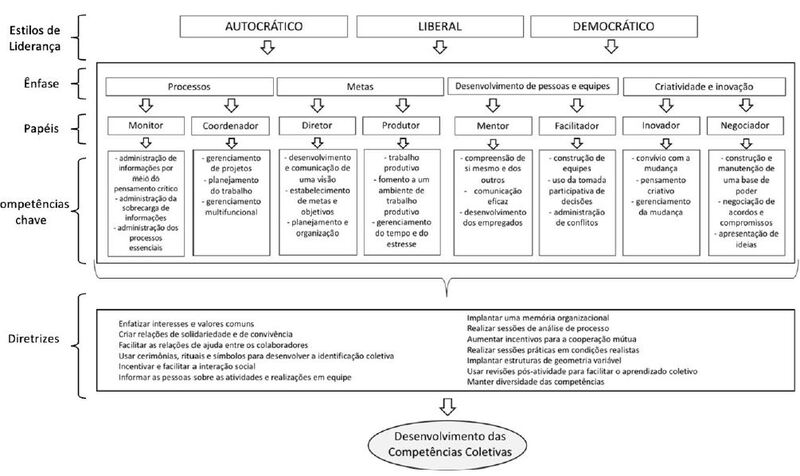 No primeiro componente da figura 3 estão alocados os estilos de liderança: autocrático, liberal e democrático. Esses três estilos irão influenciar um conjunto de caraterísticas do líder representados pelos componentes de ênfase, papéis e competências chaves, propostas por Quinn et al. (2003). O líder autocrático com comportamentos de direção e controle, está voltado principalmente na ênfase dos processos e metas. O líder democrático determinado pela participação e orientação, envolve principalmente comportamentos com ênfase no desenvolvimento de pessoas e equipes, criatividade e inovação. O líder liberal é caracterizado pela intervenção de comportamentos apenas quando acreditar ser necessário, desta forma, não possui ênfase definida.