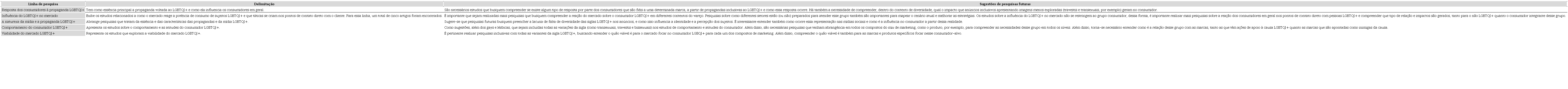 Linha 02 – Influência do LGBTQI+ no mercado: Apesar de ser uma linha nova, as pesquisas são de bastante interesse, já que o mercado pode reagir de formas distintas sobre determinados contextos, como já explorado na bibliografia encontrada. Considerando os achados na presente linha, é importante que sejam realizadas mais pesquisas entendendo a reação do mercado sobre o consumidor LGBTQI+ em outros contextos além do mercado imobiliário. Pesquisas sobre como diferentes setores estão (ou não) preparados para atender esse grupo também são importantes para mapear o cenário atual e melhorar as estratégias. Os estudos sobre a influência do LGBTQI+ no mercado não se restringem ao grupo consumidor, dessa forma, é importante realizar mais pesquisas sobre a reação dos consumidores em geral nos pontos de contato direto com pessoas LGBTQI+, e compreender que tipo de relação e impactos são gerados, tanto o não LGBTQI+ quanto o consumidor integrante desse grupo.