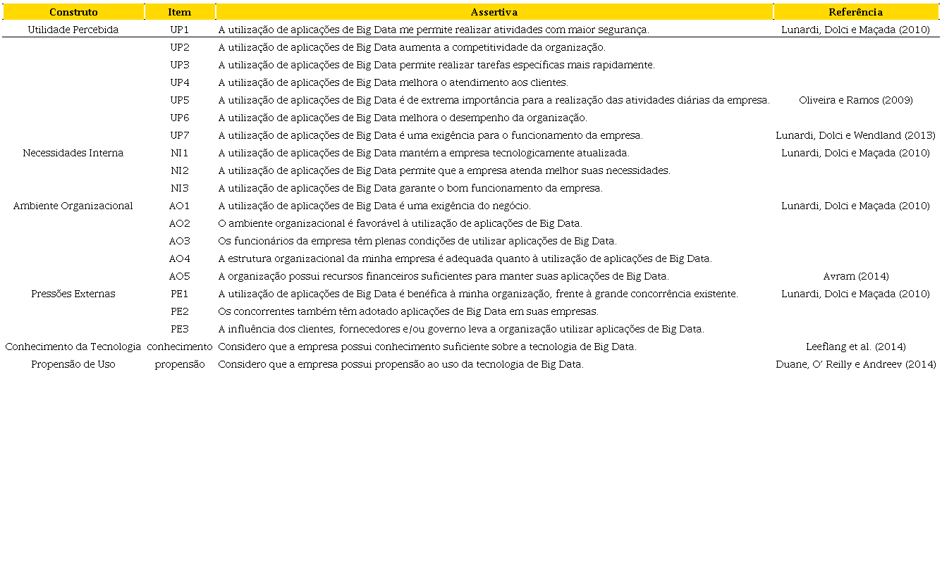 Baseando-se na análise sobre a adoção de ferramentas de Tecnologia da Informação no Desempenho Organizacional desenvolvida por Lunardi, Dolci e Maçada (2010), observou-se a adaptação do modelo teórico proposto pelos autores, bem como sua extensão para a utilização das aplicações de Big Data pelas organizações. O modelo conta com 4 dimensões oriundas do modelo original – ambiente organizacional, necessidade interna, pressões externas e utilidade percebida –, além da inclusão de 2 variáveis dependentes – conhecimento e a intenção de uso de ferramentas sobre a temática do Big Data. Estes construtos são apresentados a seguir: