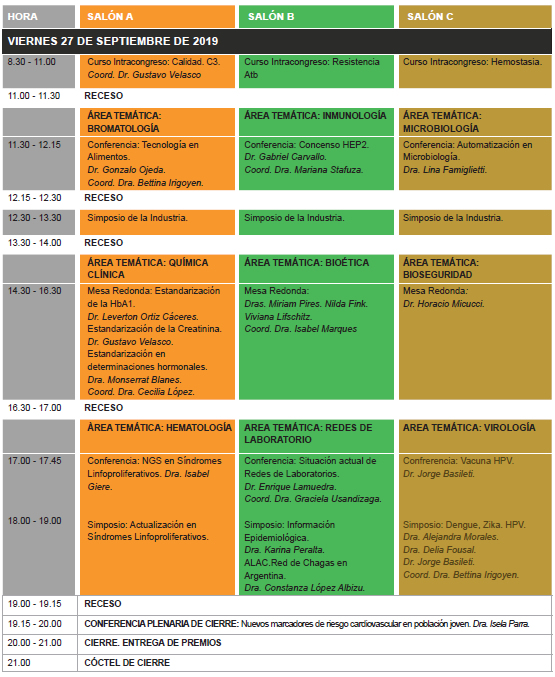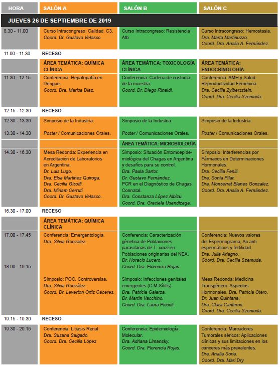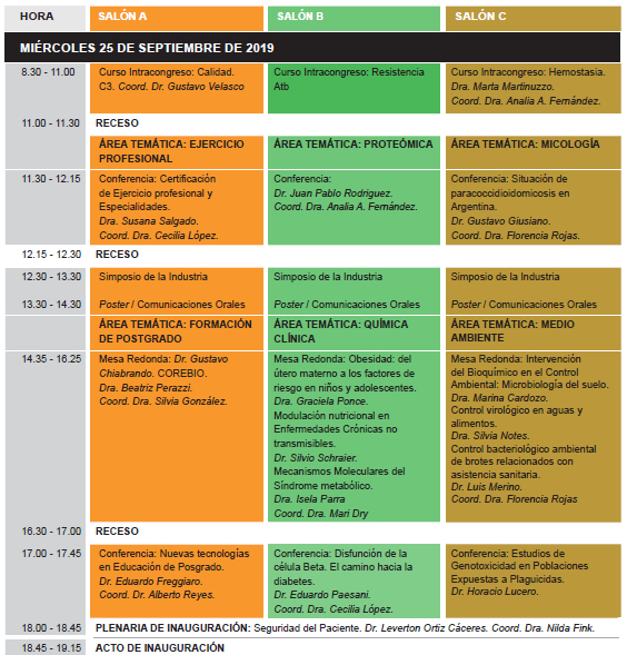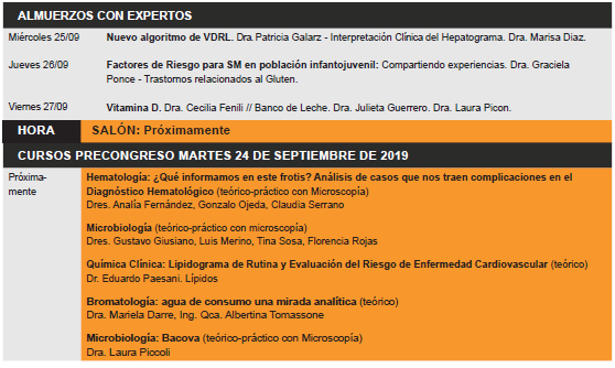 Como bioquímicos sabemos el gran desafío al que nos enfrentamos en la actualidad llevando adelante nuestro ejercicio profesional con un cambio de paradigma que nos ofrece también una gran oportunidad. Creemos que la educación continua y la actualización profesional son pilares básicos para enfrentar este gran desafío. Trabajaremos arduamente para poder ofrecerles actividades que nos permitan abonar estas áreas (simposios, talleres, actividades con expertos, controversias, conferencias). También entendemos que la exposición comercial cumple un rol fundamental en un intercambio que siempre resulta beneficioso para todos, por lo que nos pondremos a disposición de las empresas brindándoles un ambiente propicio en el que puedan satisfacerse las necesidades de todos.