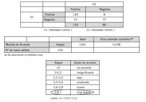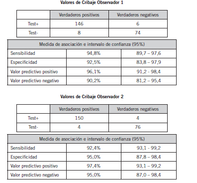No se observaron diferencias estadísticamente significativas entre los valores de sensibilidad (S) y especificidad (E) estimados para cada uno de los observadores (O), (S/O1) 94,8%; IC95% (89,7-97,6); (S/O2) 97,4%; IC95% (93,1-99,2) y (E/O1) 92.5%; IC95% (83,8-96,9); (E/O2) 95,0%; IC95% (87,0-98,4) (Tabla IV). La eficiencia global del test según operador fue 94,02% IC95% (90,76-97,27) y 96,58% IC95% (94,04-99,12), respectivamente.