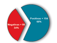 Del total de muestras analizadas con el método de Telemann, el 65,8% (154/234) fueron positivas y el 34,2% (80/234) negativas (Fig. 1). A partir de observaciones aleatorizadas y repetidas se estimó la acordancia de resultados intraoperador, 90,3% y entre operadores 90,5% (Tabla II). En observaciones independientes se obtuvo un índice de concordancia muy bueno entre operadores, Kappa=0,83 (Tabla III).