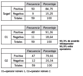 Los observadores examinaron paralela e independientemente las muestras mediante las dos técnicas de diagnóstico. Cada observador realizó el registro de los resultados en la base de datos.