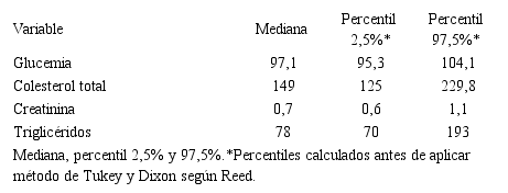 En las Tablas I y II se presentan las estadísticas descriptivas de las variables estudiadas en las muestras: media aritmética, mínimo, máximo, desviación estándar (DE), medianas y percentiles de los valores correspondientes a glucemia, colesterol total, creatinina y triglicéridos, para un número de muestras (n=23).