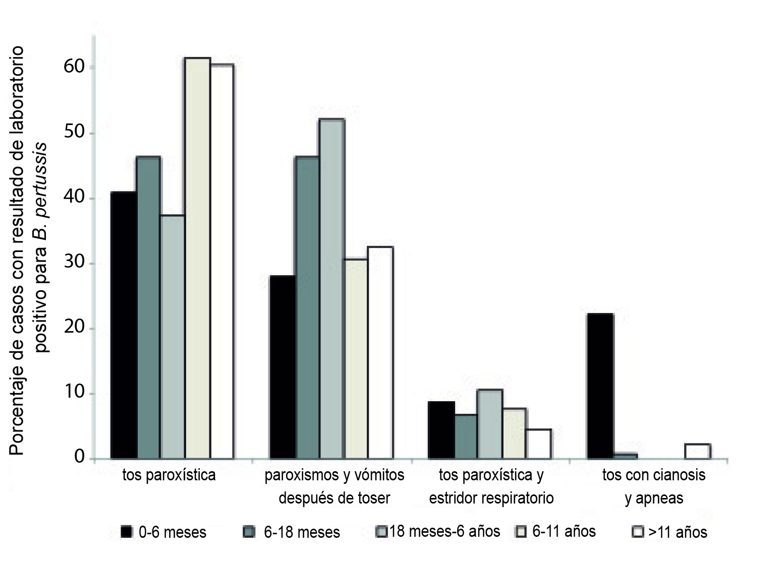 Figura 1. Porcentajes de casos según sintomatología y edad de los pacientes con pertussis.