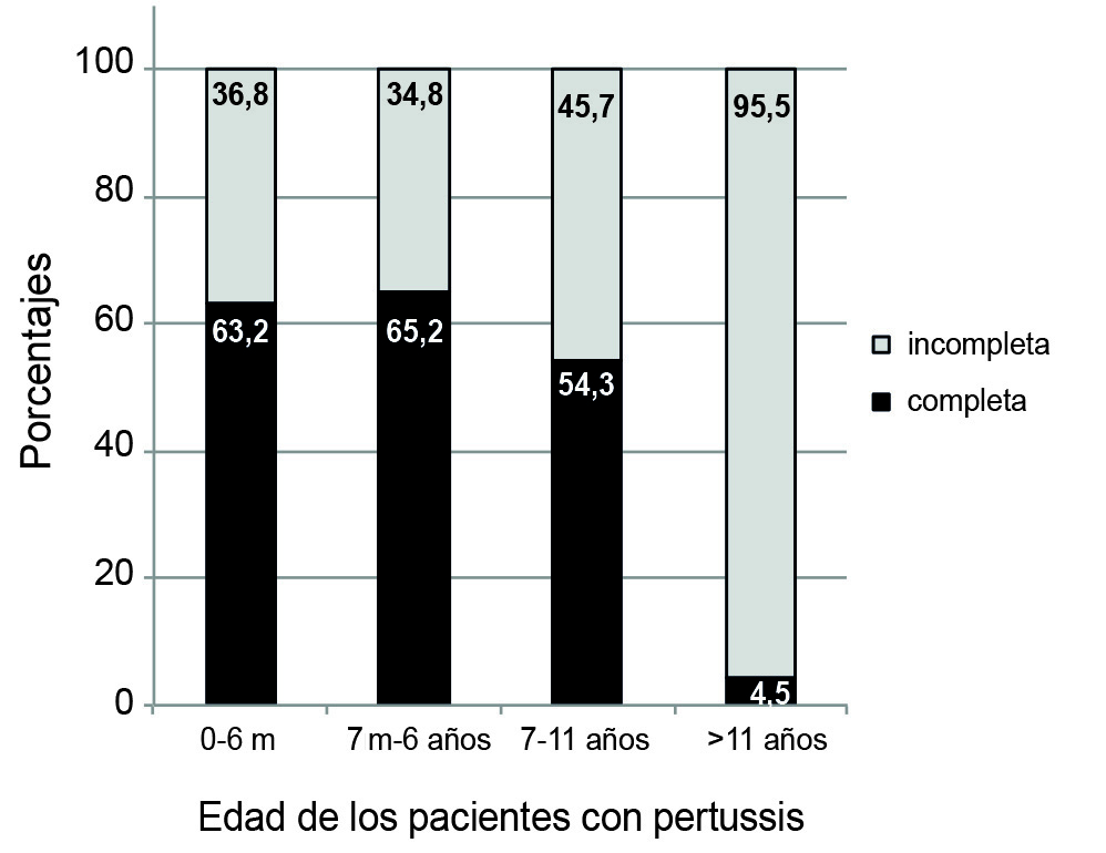 Los datos sobre los síntomas del paciente y la edad estaban disponibles en el 85% del total de casos confirmados. La Figura 1 ilustra las diversas manifestaciones clínicas. La tos con apnea y cianosis se produjo con mayor frecuencia en lactantes menores de 6 meses, mientras que los paroxismos o vómitos después de la tos fueron más comunes en niños mayores de 6 meses. Como era de esperar, los niños pequeños no vacunados tenían más probabilidades de tener una enfermedad grave, sufrir complicaciones, requerir hospitalización o morir que los niños mayores y los adultos. Con respecto a la distribución de casos confirmados de pertussis según la edad del paciente y el estado de vacunación, de los casos confirmados, en el 72,6% (2.338/3.220) esos datos estaban completos, con un 26,5% (619/2.338) no vacunados debido a una edad inferior a 2 meses. Del total de lactantes con menos de 6 meses, el 45,3% y el 54,7% recibieron programas de vacunación completos e incompletos para la edad, respectivamente (Fig. 2). El porcentaje de pacientes con esquemas incompletos para niños mayores de 6 años fue del 46,3% y para adolescentes mayores de 11 años aumentó hasta el 93,6%. Aunque este último porcentaje es alto, este grupo de edad contenía considerablemente menos individuos que los menores de 6 meses (44 individuos frente a 1.590).