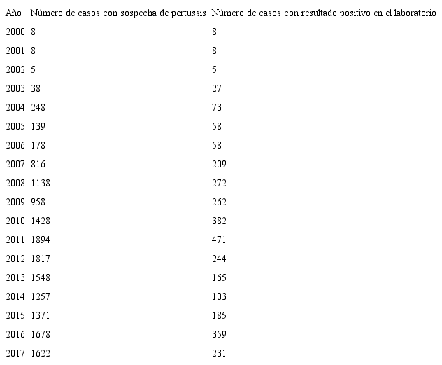 Tabla I. Distribución de casos con sospecha de pertussis y casos con resultado positivo para Bordetella pertussis en el laboratorio.