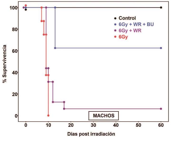 Se evaluó la supervivencia de los animales durante un período de 60 días luego de la irradiación y de los tratamientos ensayados. Los resultados obtenidos mostraron que, en ambos sexos, una dosis de rayos X de 6 Gy redujo severamente la supervivencia (Fig. 1)(Fig. 2).