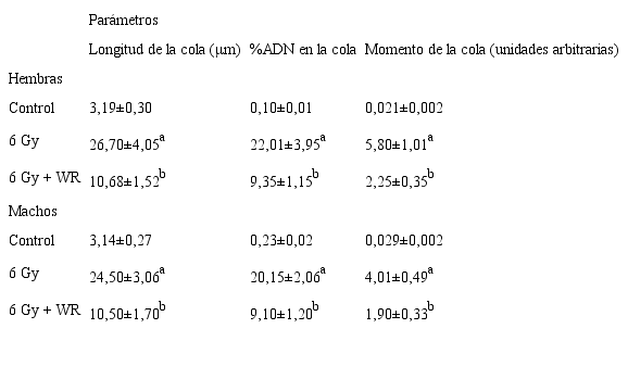 En las ratas hembras se observó que la irradiación con una dosis de rayos X de 6 Gy condujo a un incremento significativo de imágenes de Cometa en los leucocitos a una hora de irradiarse. La diferencia en todos los parámetros determinados, longitud de la cola, %ADN en la cola y el momento de la cola fue muy significativa (Tabla I). La amifostina mostró un efecto protector claramente significativo sobre el daño oxidativo producido por la radiación. De todos modos, en ningún caso se llegaron a recuperar los valores del control.