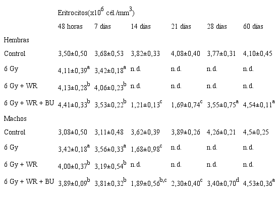 Tabla II. Efecto de la irradiación con rayos X y de los tratamientos radioprotectores sobre los parámetros hematológicos: eritrocitos.