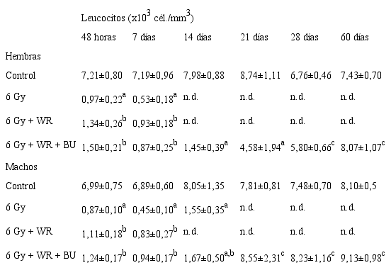 Tabla III. Efecto de la irradiación con rayos X y de los tratamientos radioprotectores sobre los parámetros hematológicos: leucocitos.