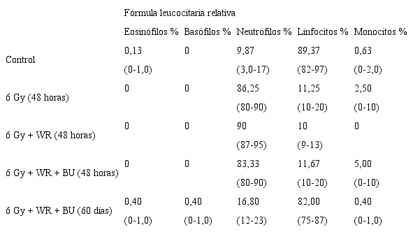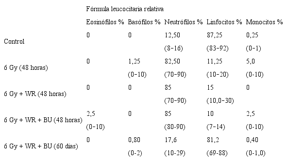 En el caso de los leucocitos de las ratas de ambos sexos, la radiación produjo una disminución severa en el número total y una alteración marcada en la fórmula leucocitaria relativa desde la primera medida a las 48 horas (Tabla III)(Tabla IV)(Tabla V). El tratamiento con amifostina y butirato de sodio pudo revertir esta condición, y se alcanzaron niveles normales de leucocitos a partir de los 28 días en las hembras y de 21 días en los machos. A los sesenta días los animales irradiados y tratados con amifostina y butirato de sodio lograron restablecer la fórmula leucocitaria normal (Tabla IV)(Tabla V).