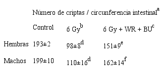 La radiación ionizante produce alteraciones muy severas en el epitelio del intestino delgado y este efecto pudo verificarse en el modelo experimental estudiado. Un modo cuantitativo para evaluarlo es a través del número de criptas por circunferencia intestinal (Tabla VI). Los resultados muestran que el tratamiento combinado de amifostina con butirato de sodio logró recuperar el número de criptas de modo significativo en ambos sexos, aunque sin alcanzar los valores del control. Por otra parte, las alteraciones histológicas observadas y descriptas también por otros autores, como la menor altura de las vellosidades, el edema o el daño vascular, también fueron reducidas por el tratamiento, como pudo observarse en los especímenes tomados de los animales sobrevivientes a sesenta días (22).