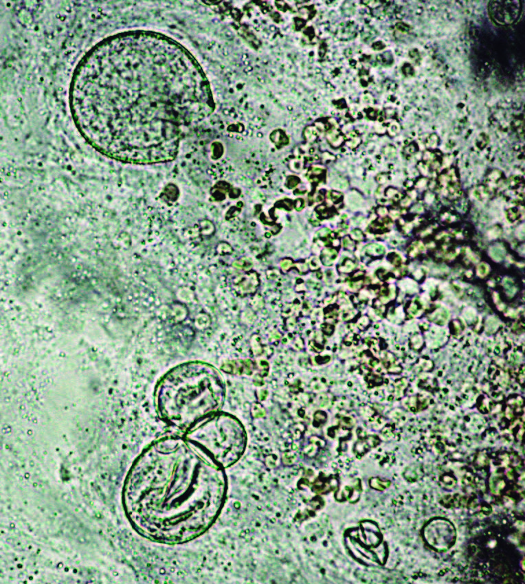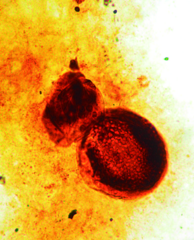 Las figuras 1 (izquierda) y 2 (derecha), muestran esférulas de Coccidioides observadas en una secreción respiratoria obtenida por expectoración, perteneciente a un paciente portador de un cuadro de neumonía aguda, oriundo de la provincia de Catamarca donde realizaba tareas en la construcción de caminos. La primera de ellas es un examen en fresco y la segunda es una preparación teñida con una modificación rápida de la técnica de Grocott (donde se observa mejor una gran cantidad de endosporos dentro de las esférulas).