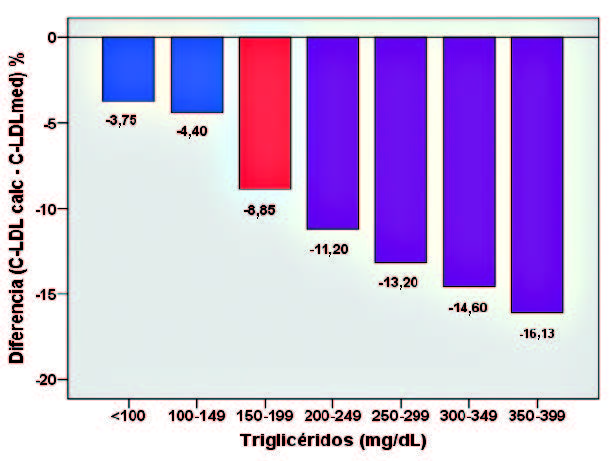 En este laboratorio se realizó la comparación del C-LDL calculado y el medido por métodos directos (C–LDLc y C-LDLd) en una población de este medio (n=3.959) con TG menor de 400 mg/dL (datos aun no publicados). Si bien se observó una correlación muy cercana (r= 0,98 p<0,001), en el caso de C-LDLc se observó una subestimación de los valores a partir de TG >150 mg/dL, dando origen a discordancias entre ambos métodos. Los resultados se muestran en la Figura 2, donde se observa el aumento del sesgo entre los dos métodos en función de los TG. Esta variabilidad analítica puede provocar subestimación del riesgo de enfermedad cardiovascular aterosclerótica.