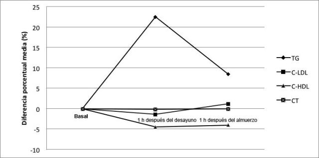 El cambio posprandial más importante que se registró en el presente estudio correspondió a los TG después del desayuno (22,5%); sin embargo, no superó el VRC, por lo que no representó un cambio clínicamente significativo.