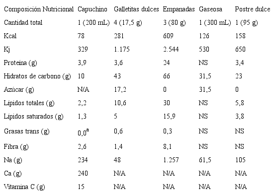 Inmediatamente después de la flebotomía, las voluntarias tomaron un desayuno estandarizado que incluyó 200 mL de capuchino y 4 galletitas dulces tipo “pepas”, cuya información nutricional se muestra en la Tabla I. Trascurrida una hora de la ingesta se repitió la extracción de sangre (T1). Con posterioridad a esta segunda extracción las voluntarias se retiraron para realizar sus actividades diarias habituales y retornaron al mediodía (13 horas) para recibir un almuerzo estandarizado que consistió en 3 empanadas de carne, 300 mL de gaseosa y un postre dulce (Tabla I). Luego de una hora de la ingesta se tomó una nueva muestra sanguínea (T2). La medición plasmática de lípidos se realizó una hora pos ingesta porque estudios previos habían demostrado que ese tiempo está comprendido en el período de tiempo posprandial en el que se producen los cambios máximos de los analitos estudiados (7) y además es posible que los pacientes concurran al laboratorio para realizar las pruebas bioquímicas una hora después de haber ingerido alimentos.